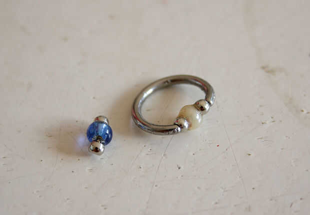 Y aun cuando hiciste tu anillo de montar esta pieza en particular, no podría caber la siguiente que hizo. Aunque de hecho estos dos (el azul y la perla) con exactamente el mismo tipo de material, el azul es ligeramente más pequeño que la perla y no se ajusta este anillo ahora mismo. Así que necesitará ajustar ya sea si usted perfora más, o tiene anillos específicos para cada 'bola'.
