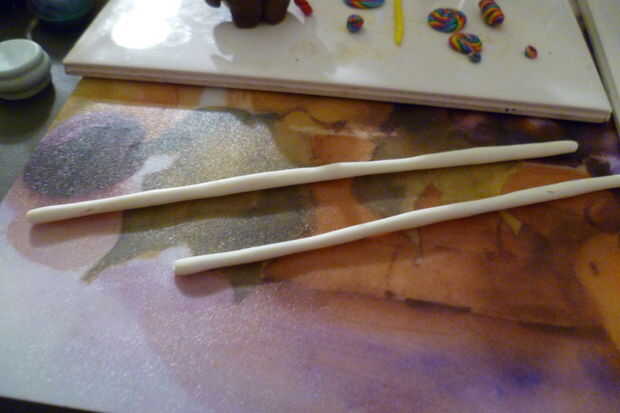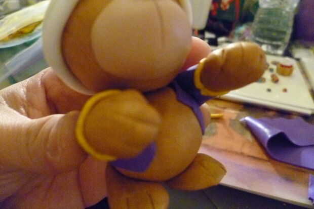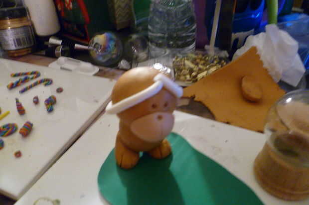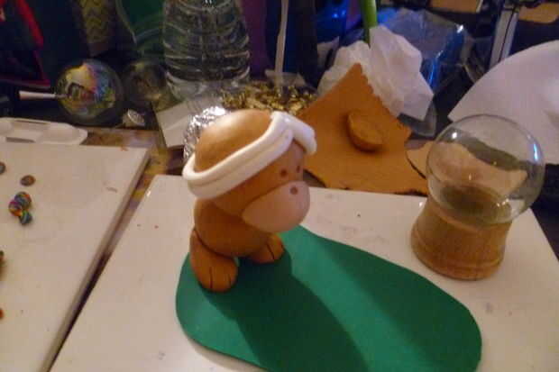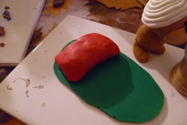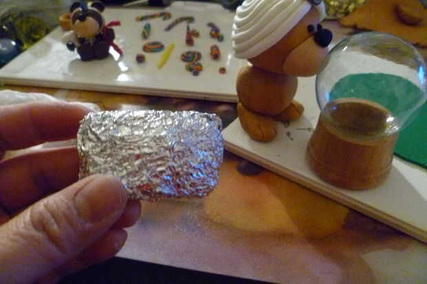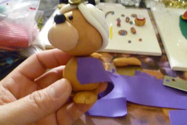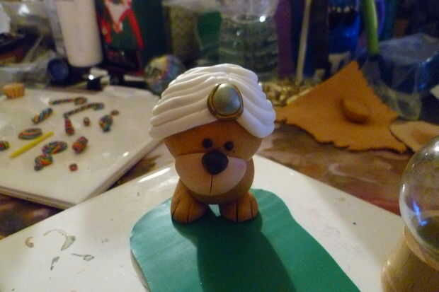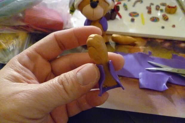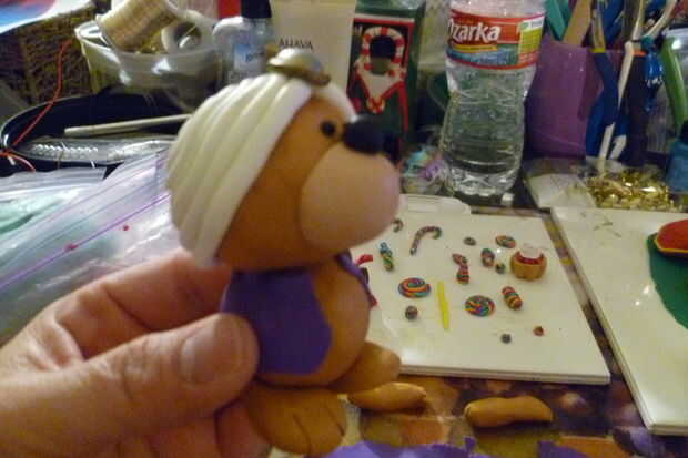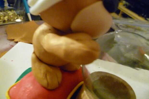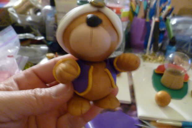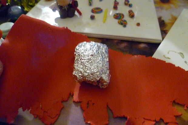 El oso es bastante grande usé mirado encima de papel de aluminio y cubierto con arcilla para el cuerpo. También en forma de papel de aluminio en forma rectangular redondeado para la almohada y había cubierto con arcilla roja.
