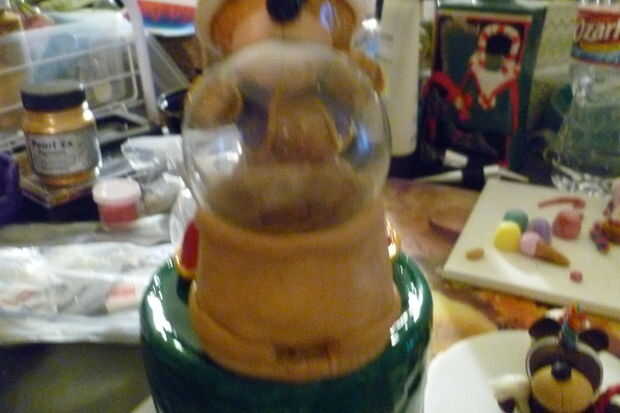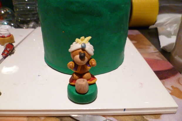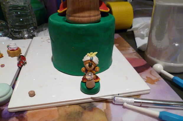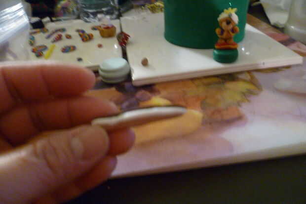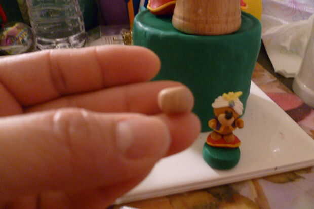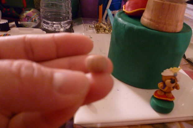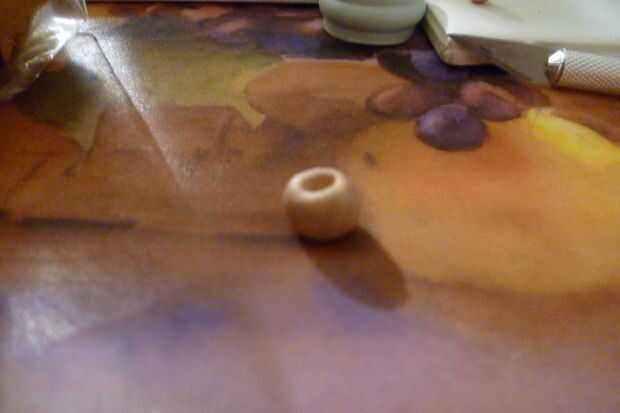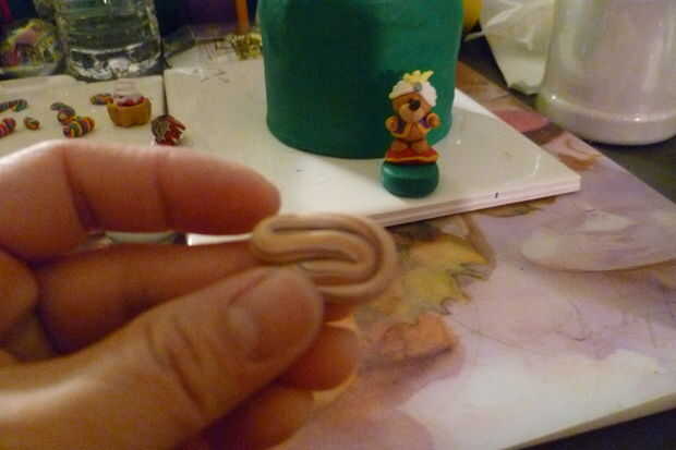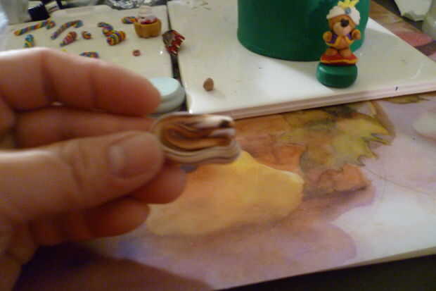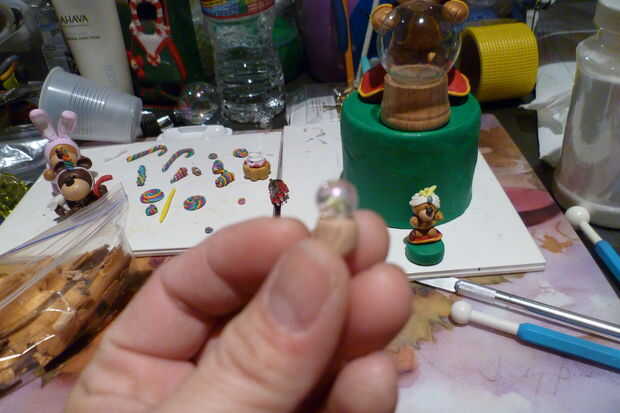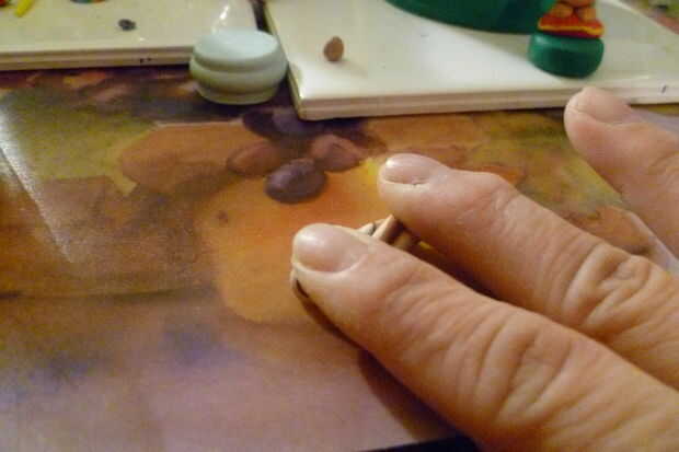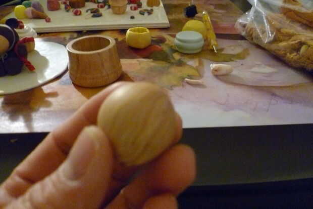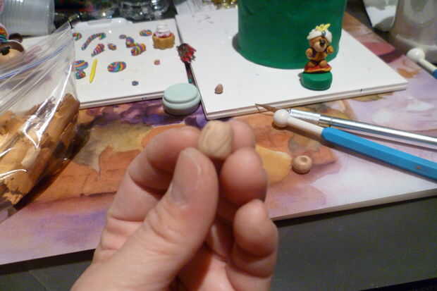Rollo de la arcilla de color madera en una bola y alargar en un cilindro grueso para la mini bola. La imagen muestra un grano que originalmente planeaba usar en el mundo de agua. Puede usar este y saltarse la electrónica y utilizar la base de madera original para el mundo.