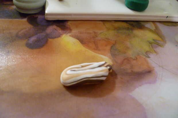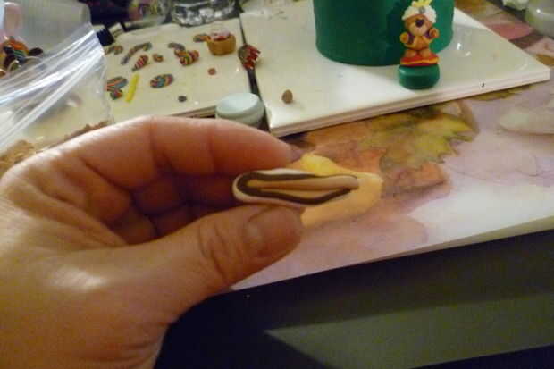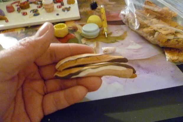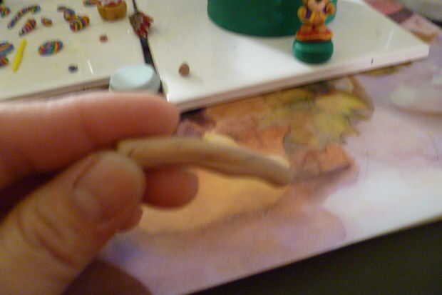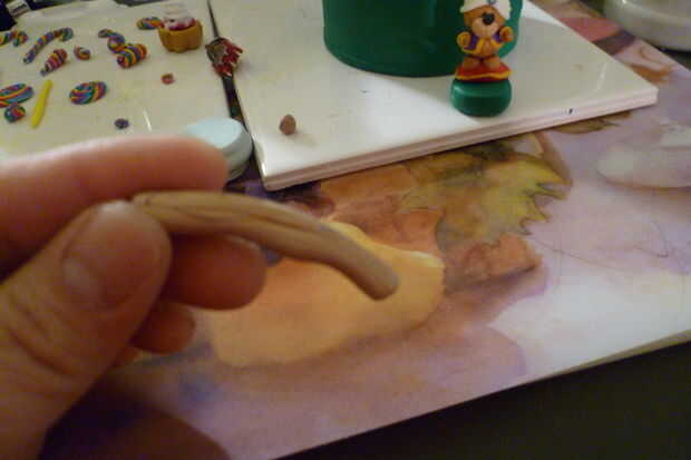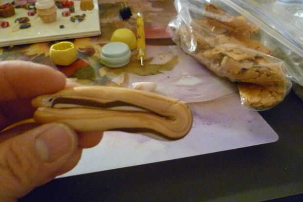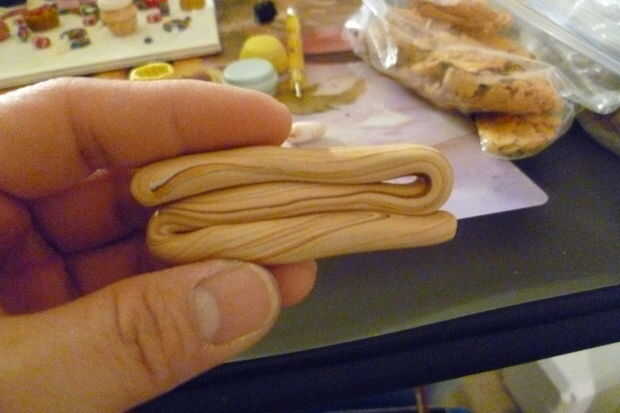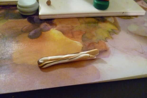Tomar algunos arcilla beige y rodillo en un registro. Tomar algunos arcilla oscurezca de marrón y blanca y rodillo en registros mucho más finos.