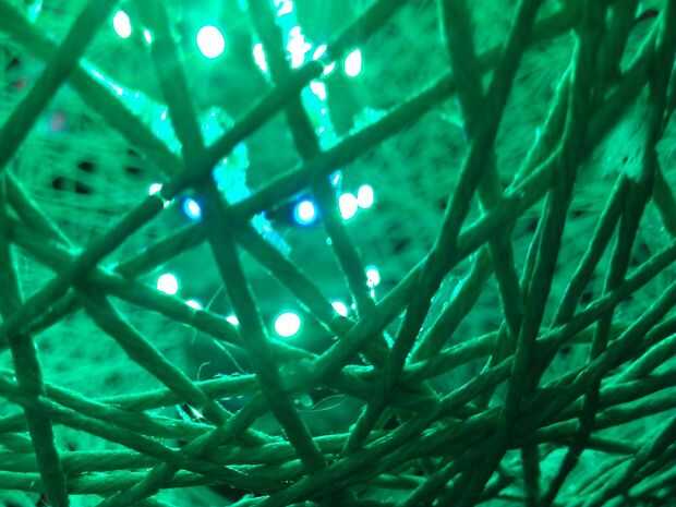 Construido para un telón de fondo de etapa este proyecto cuenta con algunas formas hexagonales de 3/4" la pipa de PEX, similar a un aro del LED hula, algunos 12 voltios RGB LED tira y un NLED 30 canal alto LED controlador de corriente. Los hexágonos