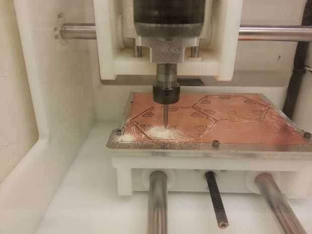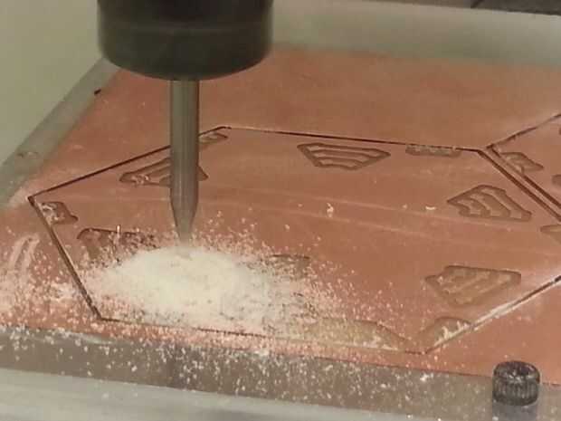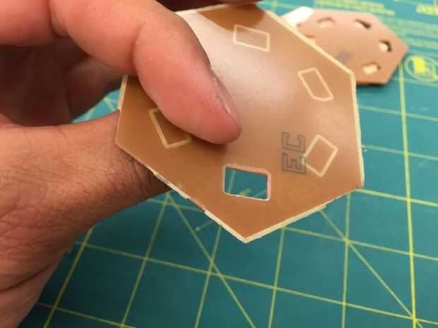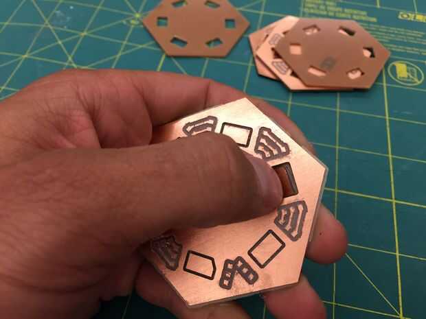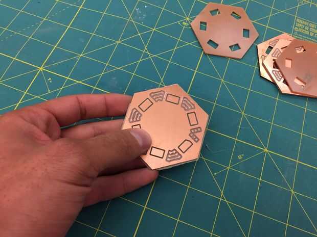 Esto es un poco más complicado debido a una limitación en el software de Othermill. Tenemos que cortar una serie de pentágonos y hexágonos. El molino se supone cortar completamente a través de la placa de circuito para el principal contorno de la forma del Pentágono o hexágono sí mismo, pero también debe cortar varias ventanas dentro de la forma principal en que brille el LED. Por alguna razón, la Othermill software es incapaz de reconocer esquemas que se adjuntan dentro de otro esquema, así que mi trabajo alrededor fue que tuve que usar dos archivos separados a cubrir juntos.