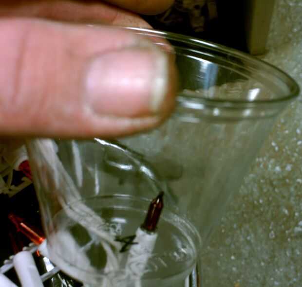 Para instalar la luces poke un agujero con el soldador y rápidamente instalar la bombilla. Hacer el agujero un poco más pequeño que el diámetro del bulbo por lo que es un ajuste de fricción. Instalar tres luces por taza (tazas de 50 X 3 = 150 luces).