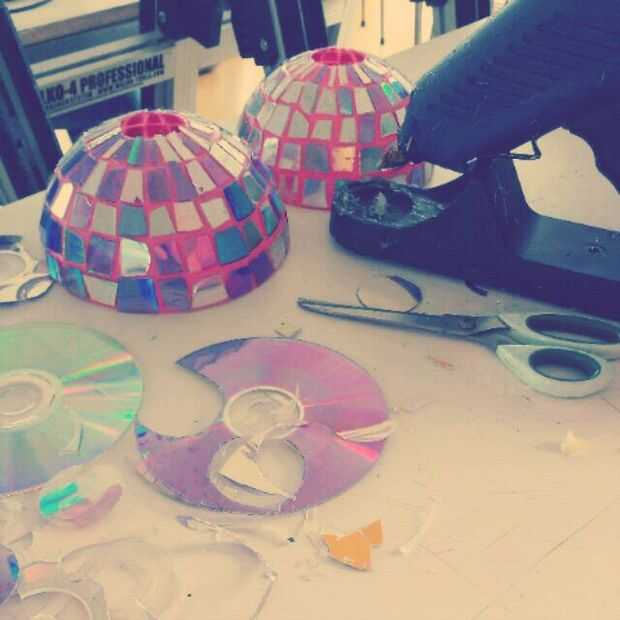 Cuando nuestros dos bolas de discoteca medio donde finalmente impreso, nos coverd en pedazos de CDs. También hemos cortado te CD con tijeras, pero podemos cortar con un cuchillo. Tendrá mutch más largo, pero usted puede cortar las piezas de CD en una mejor forma. .