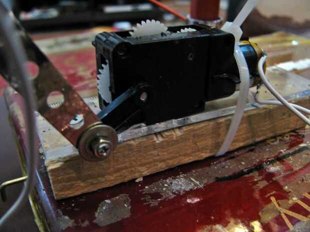 Mecanismo es un simple motor de engranaje conectado a una barra de equilibrio. La bola sirve como un interruptor para conectar dos contactos eléctricos que proporcionarán tensión para encender el motor en una dirección u otra. Los contactos eléctricos fueron inicialmente piezas de aluminio pueden, entonces utilicé 4 reglas de acero inoxidable que mejor tuve una capa no conductora de las tiras de aluminio de la arena. Utilicé dos fuentes de alimentación ajustable. Por sólo permitir que la bola ruede hacia adelante y hacia atrás, sería suficiente una sola fuente y también ambos interruptores podrían funcionar el motor en la misma dirección. Es ligeramente más eficaz que la marcha del motor en dos direcciones, partiendo de que el interruptor de la bola.
