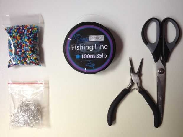 Vas a necesitar: rebordear hilo pesca línea; Granos (su elección de color y tamaño. Estoy usando tamaño 8 rojo, naranja, amarillo y blanco granos de semilla); Ganchos de pendiente; Tijeras y alicates de punta redonda; no en la foto, pero importante: alfileres de cabeza/de alambre para hacer anillos oculares pins/salto