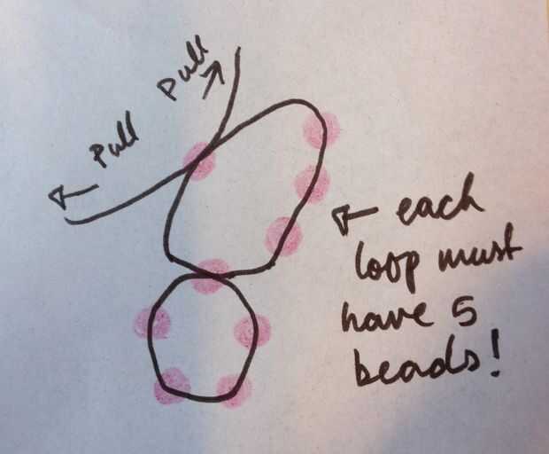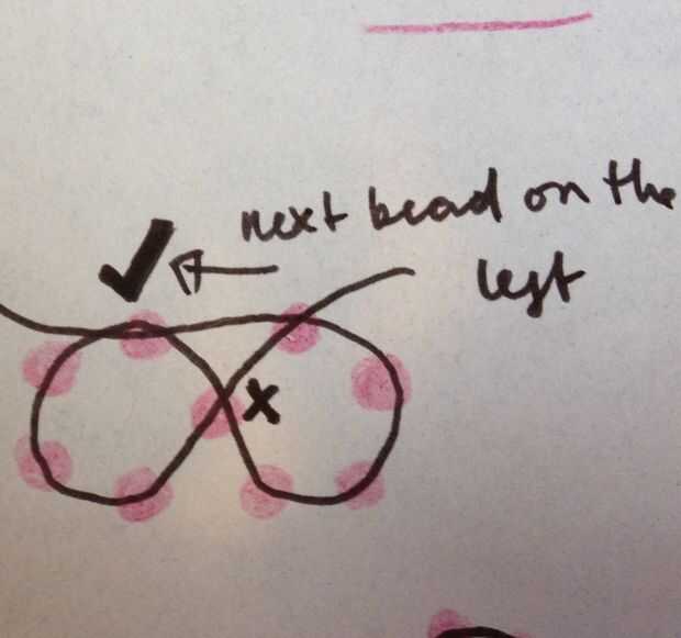 En el lado derecho de la cuerda, granos de la cadena cuatro, con la última, otra vez, hacen un lazo. Cadena la cadena ahora izquierda a través del talón próximo a la izquierda (del grano que es paralelo a la última grano no el grano siguiente en el bucle). Añadir 3 bolas en la derecha cadena y pasan a la izquierda el grano pasado encadenado para hacer otro ciclo de grano * suspiro *