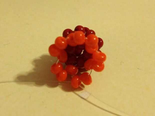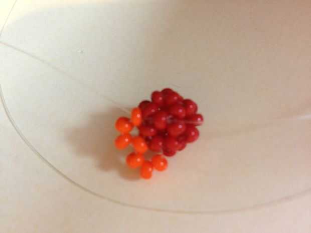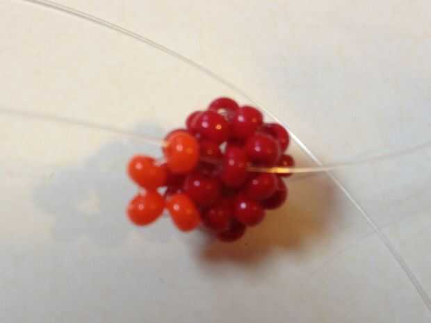 El bucle final de la primera bola actuará como el primer lazo de la segunda bola. Se trata de cómo se conectan. Este es también donde va estar cambiando colores. Usando el lazo final como tu partida, grano otra bola con cuentas. Continúan las bolas hasta que estés satisfecho con la longitud del grano