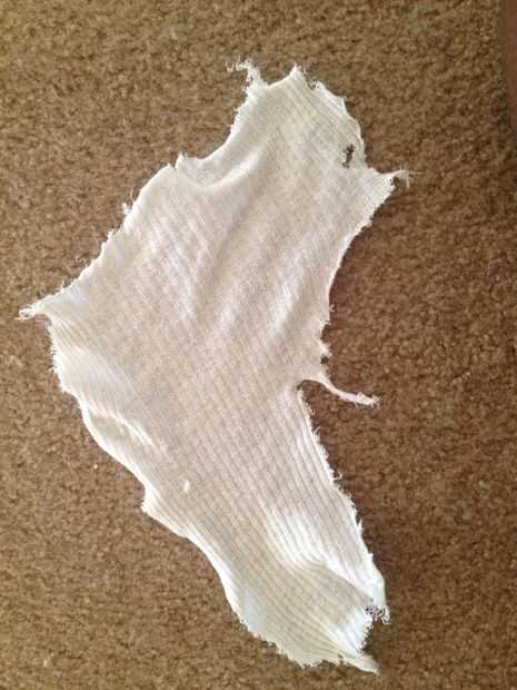 Cuando se corta la camisa vieja debe ser aproximadamente 8 pulgadas de largo. Mi pieza era un poco bruto pero no importa.
