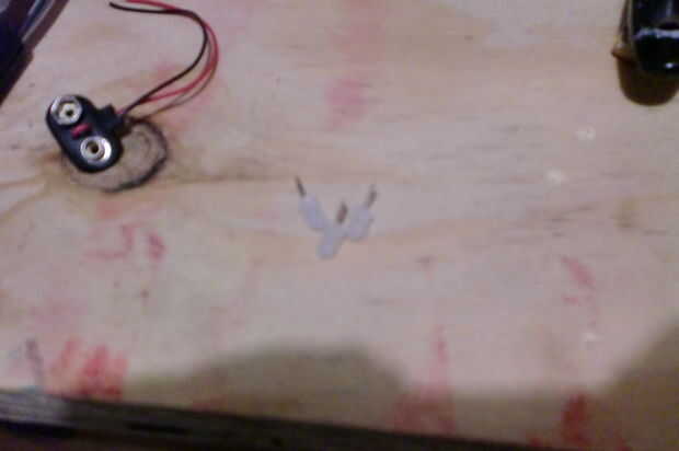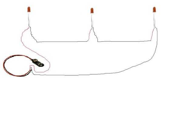 Ahora, sigamos con los cables. Desde que estoy usando tres LEDs de 3v, estoy poniendo en serie sin una resistencia (ya sé... Lo sé.. Siempre es bueno tener uno... Pero no lo hice). Cortar sobre 6, de 6 pulgadas de alambre y van desde el negativo del primer LED, a la pata positiva del LED última. Cortar un trozo más corto y soldar el cable de presión positiva, entonces a la pata positiva del LED primero. Luego un pedazo largo de alambre que va desde la pata negativa del último LED al cable negativo en el cierre. Si necesitas ayuda, mira el mal hecha (por mi) diagrama en la segunda foto. ¿Observe cómo, si fuera boca abajo, los LEDs se le cuelga? Prueba y soldadura así como eso cuelgan.
