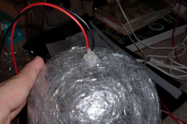 Ahora el cuchillo otra vez y hacer un poco la raja por donde usted volver a grabado la bola, luego meter el LED en él y pegamento caliente en. Intentar y conseguir pegamento caliente entre las piernas de los LEDs, así que el no corto uno contra el otro. Asegúrese de que el LED está apuntando directamente a la bola, y no es con un ángulo apuntando hacia el lado.