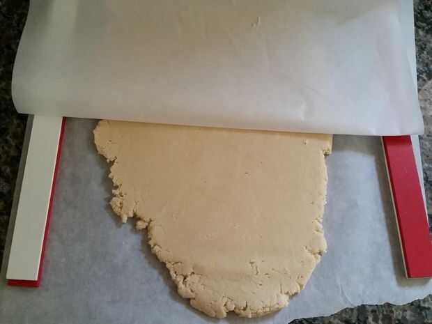 Rollo de masa para galletas de azúcar 1/2" de grosor entre dos pedazos de papel de pergamino. Coloque en el refrigerador durante 20-30 minutos facilitar formas de corte.