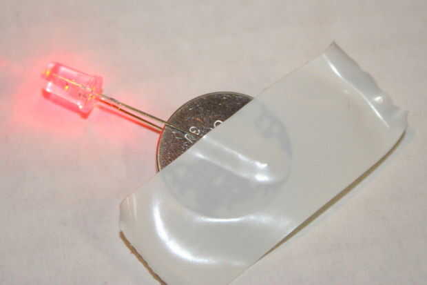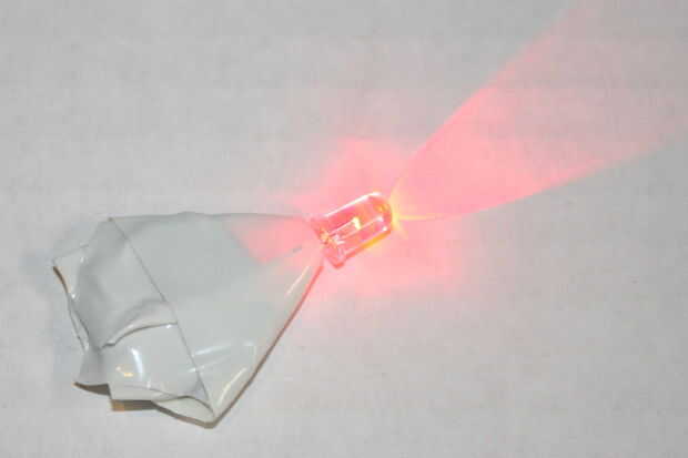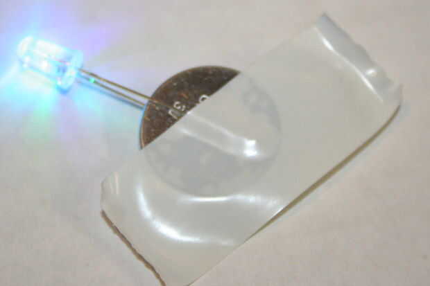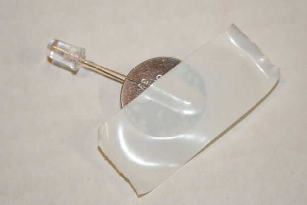 Conecte la pata más larga (+) del LED al lado positivo (+) de la batería de la moneda. Conectar la pata más corta (-) con el lado negativo (-) de la batería de la moneda. Envuelva la cinta aislante alrededor de la batería para mantener las piernas en su lugar. Cubrir el alambre expuesto todo con cinta aislante.