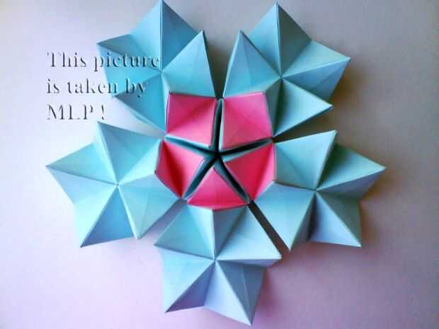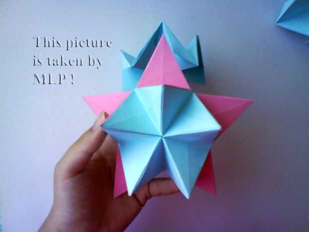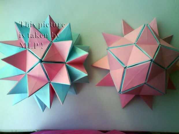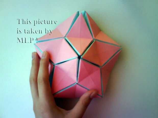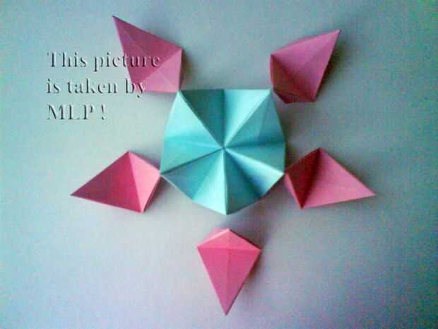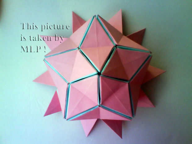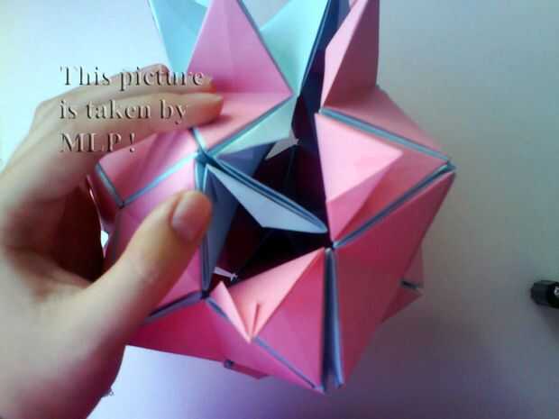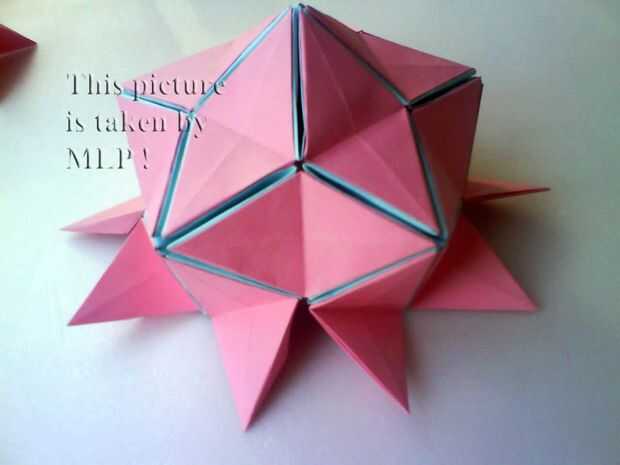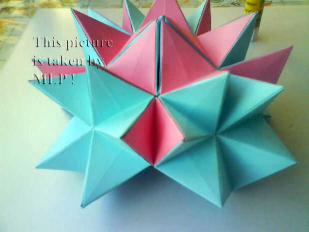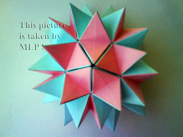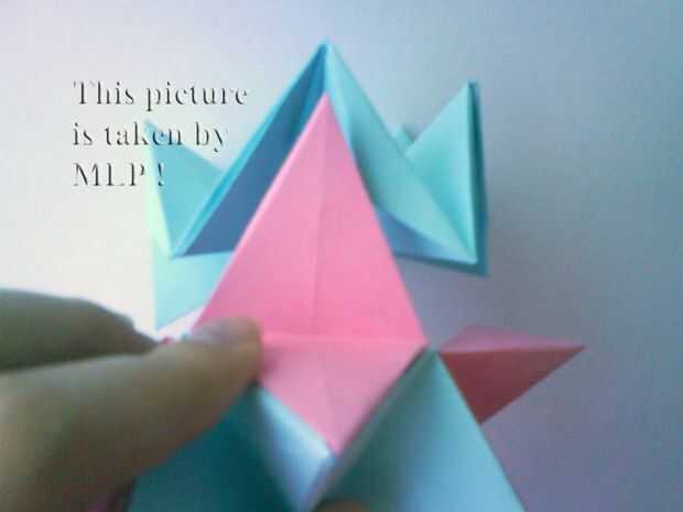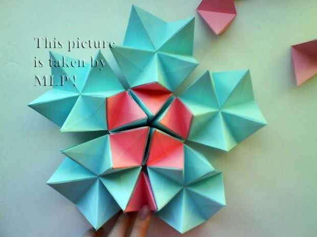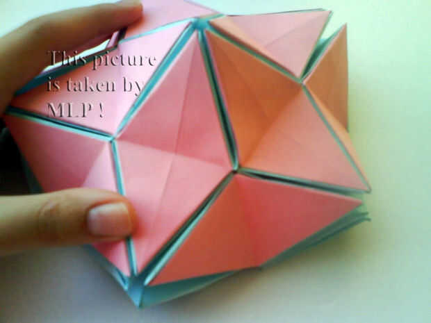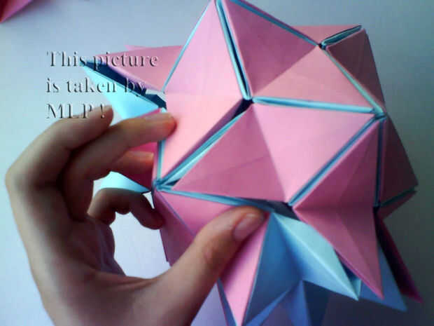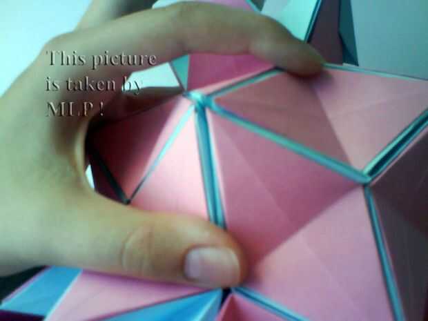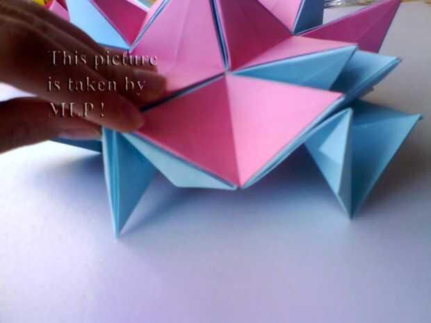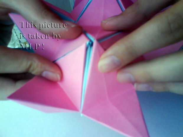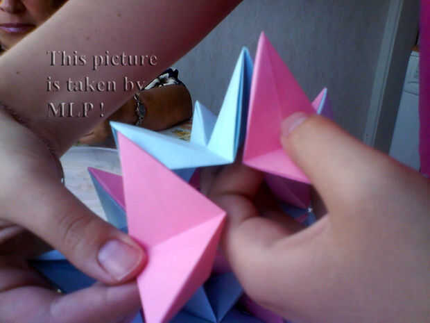 Paso 3. Luego tome 5 hojas de color rosa y conectan el azul "little stars". Cuando conectarlos cuidadosamente intenta cerrar las estrellas. Y cuando termines vas a tener la mitad de nuestra pelota. (ver cuadros 14-18)