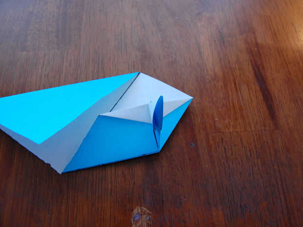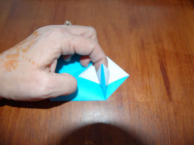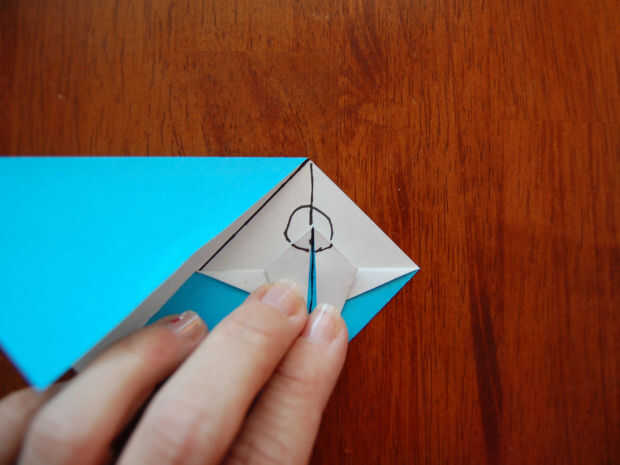 Asegúrese de que permanece centrado. Se puede ver la línea de doblez en la parte posterior del papel. Asegúrese de que el punto de que acaba de hacer está alineado con eso. [Cuadro #3]