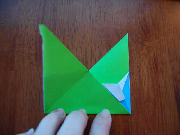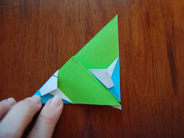 Doblar la parte superior izquierda punto hasta la parte inferior derecha, haciendo un triángulo.