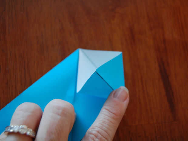 El punto superior debe doblar hasta la parte superior del centro, cerrar la bolsa. Se debe hacer un cuadrado. Arruga bien. [Cuadro #2]