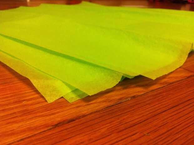 Tomar 4-8 piezas de papel de tejido, dependiendo de cómo completo desea la bola al ser (el tejido más papel el batán). Despliegan y ponen encima de la otra como se muestra arriba.