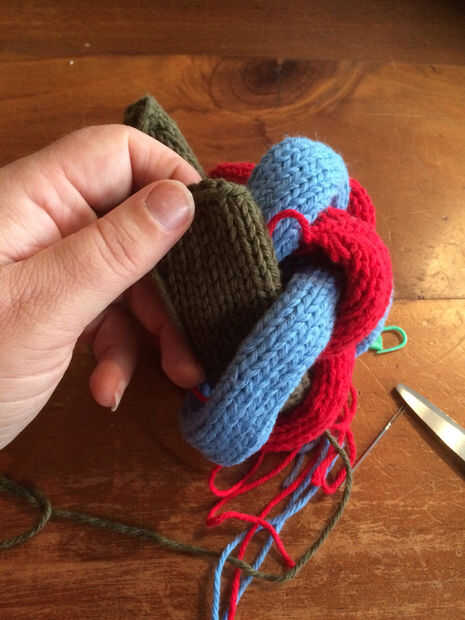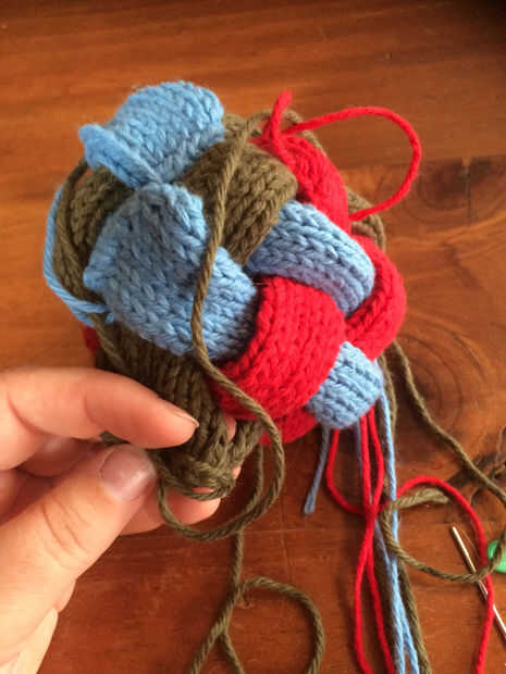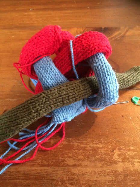 Tomar el tercer color, que verde, por lo que es lo que me voy a referir a él como. Inicio de la bobina se sobre y debajo de las tiras azules, luego rojo, luego el azul y el rojo. Coser el extremo.