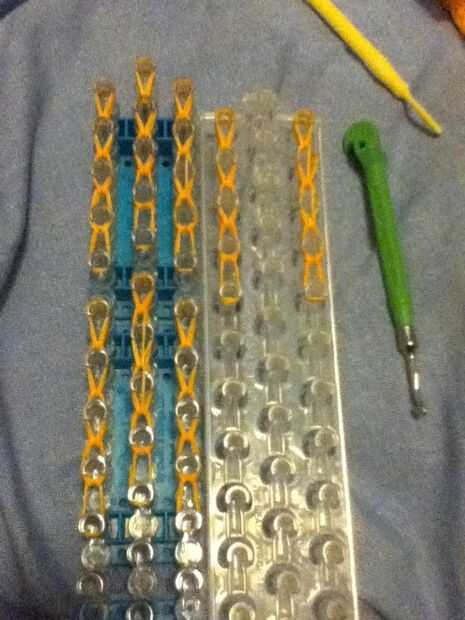 este es mi primer instructable diciéndote cómo hacer una pulsera de telar del arco iris triple.Paso 1: fuentes de Usted tendrá tablero de telar del arco iris, bandas y el gancho.Paso 2: Tres filas de bandas Poner tres filas en el telar como mostré ar