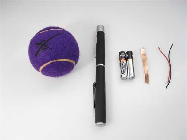 Tal vez tienes una pelota de tenis y puntero láser pero no todas las golosinas, así no se preocupe, usted puede todavía tiene usted mismo una bola de láser en cuestión de minutos. Se trata de un min Instructable sobre cómo construir una bola básica de Laser de un puntero láser, algunas baterías del AAA, un poco de alambre, cinta de cobre, cinta aislante y por supuesto una pelota de tenis.