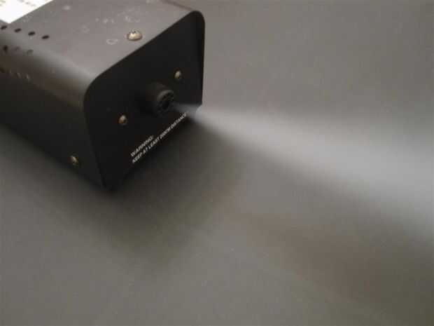 No necesitas una máquina de niebla caro captar un rayo láser con un corto de la exposición. Utilicé la máquina de la niebla vino de tienda de comestibles de todos los lugares... en la isla de Halloween! La niebla va a crear partículas microscópicas que causan el rayo láser a la dispersión en todas las direcciones, algunas de las cuales encuentran su camino en la cámara. Con niebla puede mantener la Exposición corta ideal para captura de video pero usted querrá apaga las luces para tirar el rayo fuera del ambiente fondo claro.