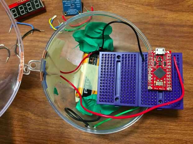 Hemos diseñado nuestra bola para encender cuando la parte superior quede en la orientación correcta. Como se muestra en el lado izquierdo de la imagen, el cable positivo dejar la batería termina en un pedazo de cinta de cobre en el borde de la parte inferior de la mitad de la bola. El cable positivo hacia el Micro Pro hace lo mismo. Una tercera tira de cinta de cobre a lo largo del borde de la mitad superior de la bola conecta estos dos cables cuando la bola quede juntos.