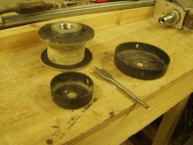 Esto era algo que ya tenía y todo lo que se necesitaba era una polea grande para el eje. Esto se hizo de varios discos de corte de madera aglomerada con un conjunto de sierras y enclavada juntos. El orificio central fue ampliado para encajar el eje de salida con una broca de 20mm. Un collar metálico que se atornilla a la base del eje impulsor fue clavado en el extremo de la pila y fija con 3 tornillos en el cuello. La superficie de corte del conglomerado quedó áspera para mejorar la fricción de la cuerda. la polea es tiempo suficiente para que la cuerda simplemente rastrear a lo largo de la atracción resulta así que la cuerda no debe tener demasiado gastada por la superficie rugosa.