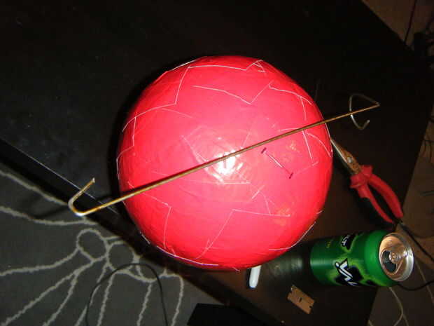 Comienzo tomando su maquinilla de afeitar y cortar una hendidura a través de la cinta y en la bola 1 ¼" largo. Haga este corte en el centro de uno de los parches para la fuerza agregada. Con sus alicates cortar una sección de perchas y doble forma de gancho en un extremo. La longitud total debe ser más larga que el diámetro de la bola. Entonces comenzó a empujar el gancho en la bola de espuma y rasga pedacitos de él fuera de la ranura que se corta. Esto le llevará un tiempo pero no correrlo que no desea rasgar la raja. Cuando piensas que tienes todo darle una sacudida y escucha cualquier bits confunde alrededor allí. Cuando piensas que tienes todo sostenga la bola con la ranura hacia abajo y darle un apretón vigoroso para eliminar cualquier resto pequeños pedacitos.