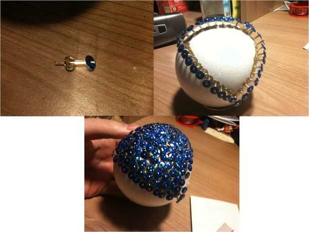 Todo lo que tienes que hacer ahora es poner una de lentejuelas, un grano largo y lentejuelas otro en la aguja un acople a la bola de espuma de poliestireno. Repetir este proceso hasta que la pelota está llena de ellos.