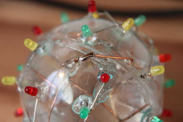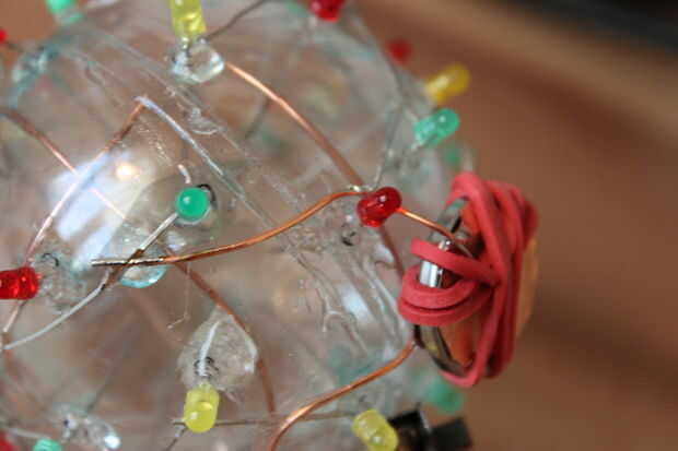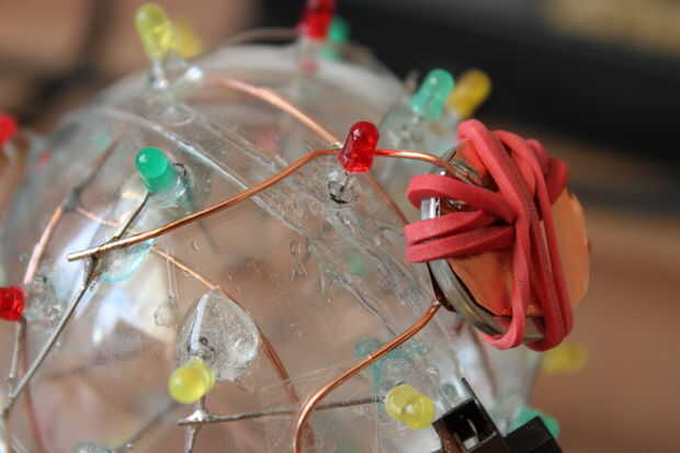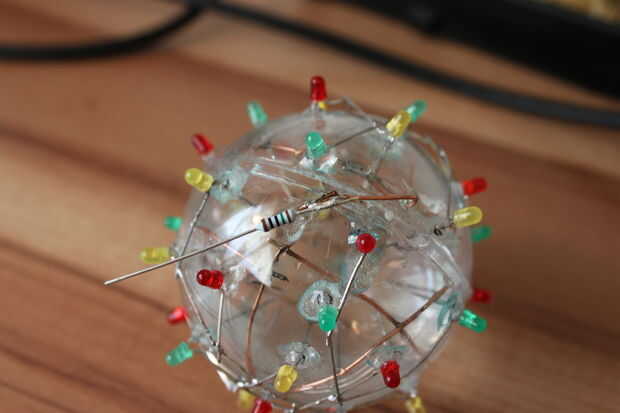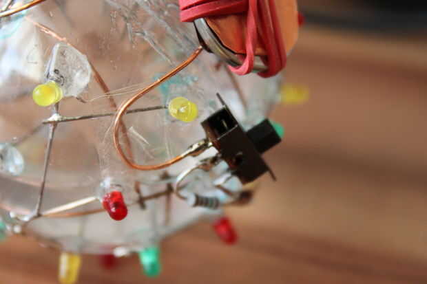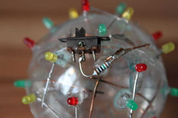 Die beiden Drähte aus den Halbkugeln werden aneinandergelötet. Daran kommt der Widerstand und un den Widerstand der mittlere Pin des Schalters. Kommt der de Pin de linke un den negativen, kleineren Kontakt der Knopfzelle. Der Pluspol der Batterie wird un die Anoden der LEDs un den beiden Halbkugeln gelötet.