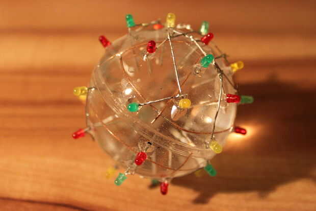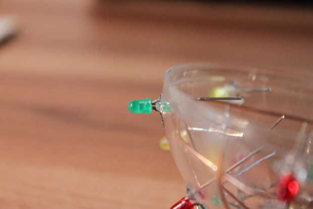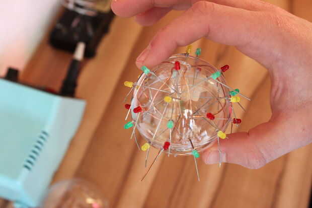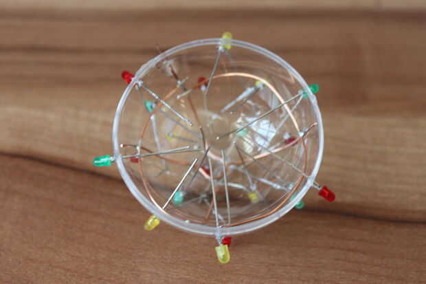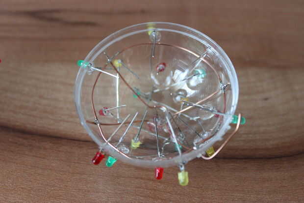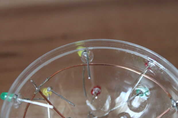 ALS Letztes werden die LEDs noch mit einem de trenzado Tropfen Epoxidharz innen und außen befestigt und abgedichtet. Um die Kugel zu testen, kann man sie mit Wasser füllen. Stelle sicher, dass die Kontakte der LEDs sauber von Kleber sind.