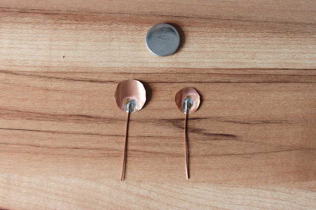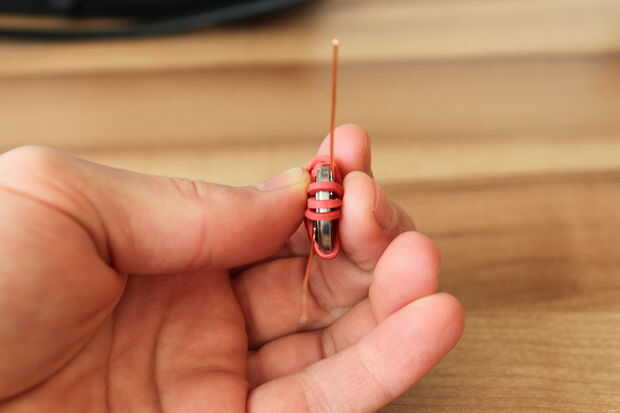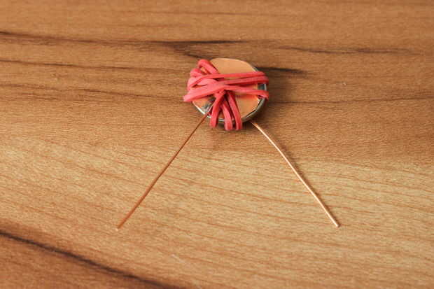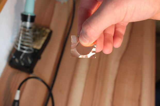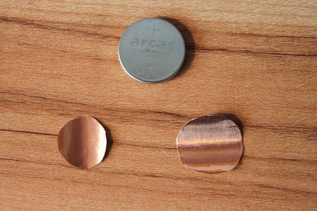 Um zwei Kontakte zur Batterie zu machen, hombre de schneidet die Kupferfolien en zwei runde Stücke en Größe der Knopfzelle, ein größerer positiver Kontakt und ein kleinerer Kontakt /negativer. Zwei Drähte werden un die Folien gelötet. ALS Letztes werden die beiden Kontakte entsprechend der Größe mit einem Gummiband un die Knopfzelle geklemmt.