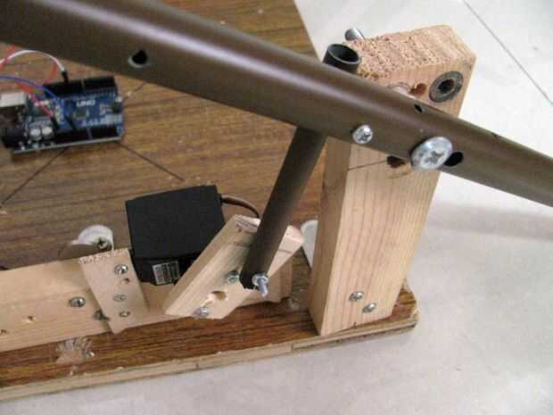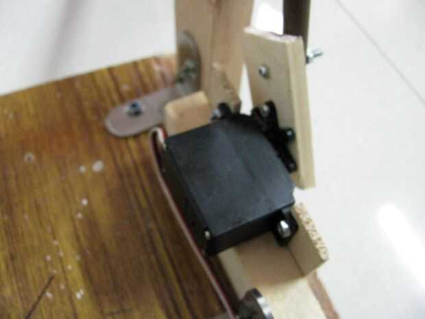 Construir algún tipo de montaje para sostener el servo y luego construir el vínculo. Os adjunto una sección corta de la madera al servo para dar punto de enganche de unos 3 cm por otra sección de 9 cm de caña de pescar para acoplar a la barra del péndulo. Tienes que jugar con los puntos de sujeción hasta que pueda conseguir la barra de movimiento arriba y abajo unos 30 cms de arriba abajo. Dimensiones exactas no son necesarios, sólo estadio, porque los ajustes reales exactos son hecho int el programa de arduino.
