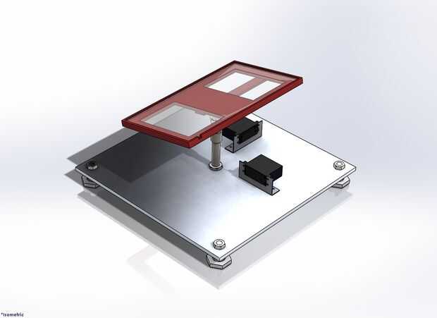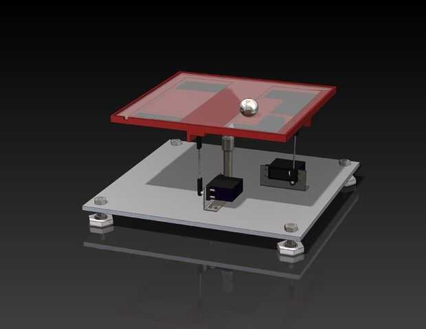 El modelo fue construido sobre la base de aluminio y bloques de lego. En el centro es juntas en dos ejes. La placa de bloques de lego está conectada al servo motores ingenio "Bola y zócalo" de las uniones mecánicas.