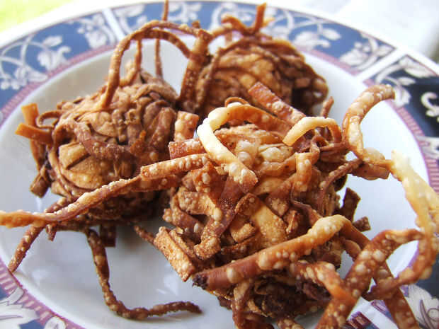 Esta receta es básicamente una bola de masa hervida China hecha de pieles de won ton (hojas delgadas de papel de masa hecha de harina, huevos y sal). Pero en Indonesia, esta cocina es conocida como Pangsit Goreng.Pieles son llena con la mezcla de car
