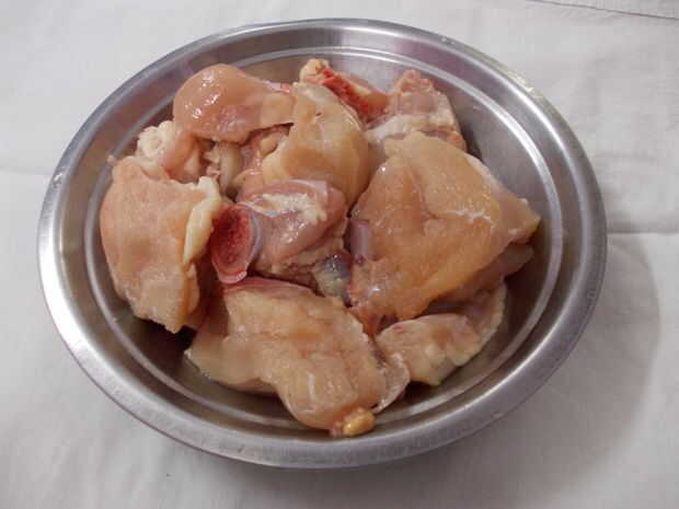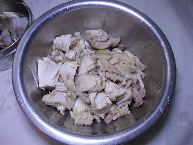 Deshuesar el pollo y recoger el pollo sin hueso en un recipiente. La parte de la carne ha perdido ya todas sus grasas en el agua, añadimos una cucharada de aceite en ella.