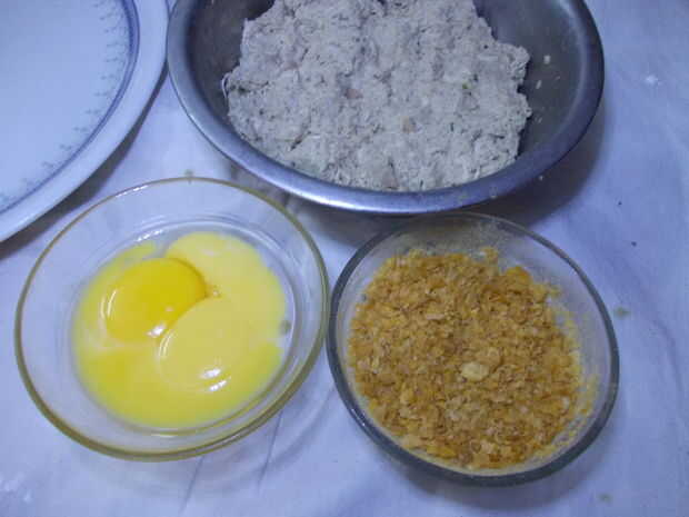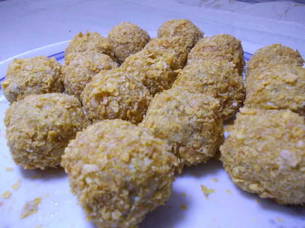 SEGUNDO: rodar la bola sobre los copos de maíz triturados para que los copos de maíz se peguen todo sobre él.