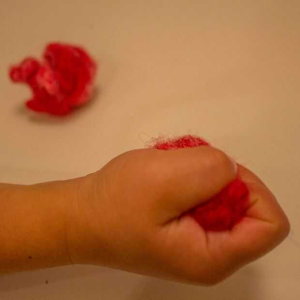 Rollo de alguna lana de mecha o hilo de lana muy suelto entre las manos hasta que se convierte en una bola semi firme. Cuando se comprimen la fibras se enrollan en una bola en sus manos secas, las fibras de lana (o – smooshed!) en una nueva forma.