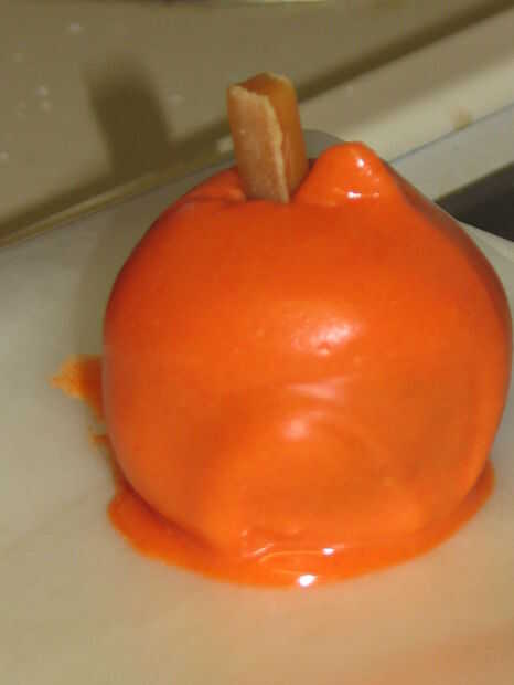 Creo que es más fácil de utilizar una selección de diente para la inmersión y un segundo palillo listo para ayudar a separar la bola de calabaza. En el agujero a la izquierda del palillo, agregar un caramelo "madre" antes de que el chocolate se enfría completamente.