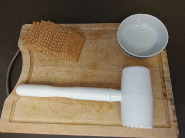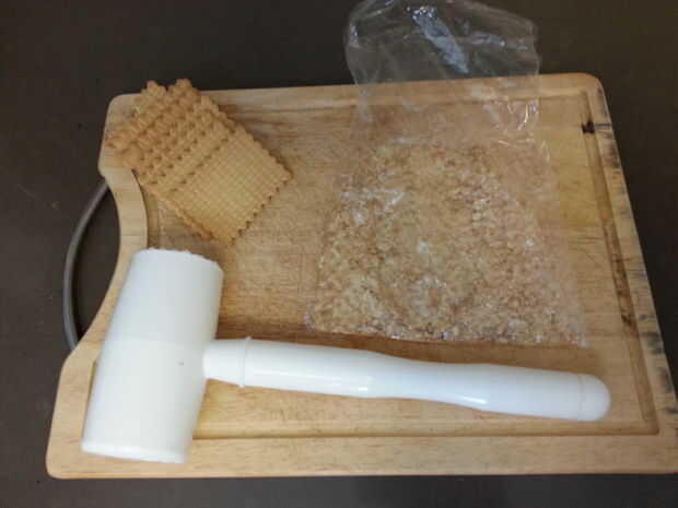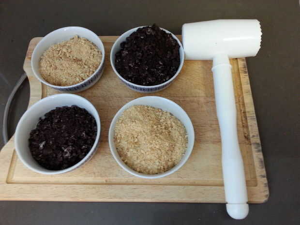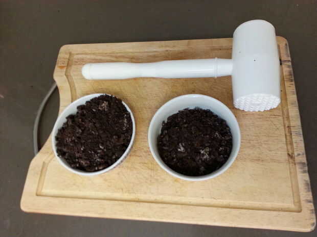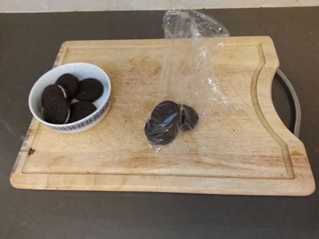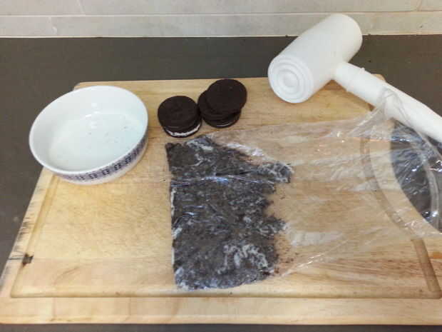 En primer lugar, poner algunas galletas Oreo en una bolsa y les aplastar con el martillo hasta que son bien pulverizados.