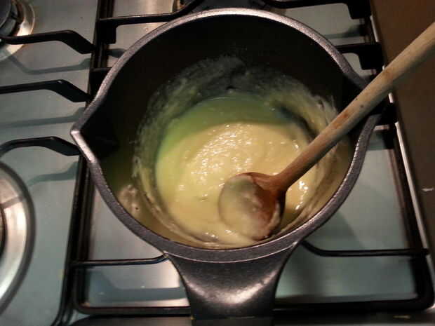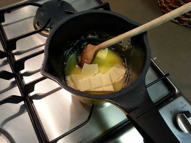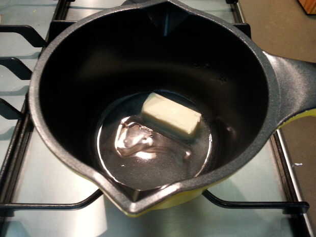 Ahora, inserte un 25 gramos de mantequilla en la olla e inicio de calentamiento con un fuego pequeño, después comienza a derretir agrega un paquete de chocolate y revuelva hasta que todo es malteada.