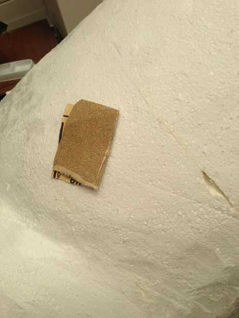 Para terminar de suavizar su forma, usted tendrá que cambiar a papel de lija (también se pueden utilizar raspadores). grano 80 es bueno para empezar, y usted no necesita ir más de 200. Lo más importante es que vas muy ligeramente con una lija, como puede golpear flojo los pedacitos de espuma. Si no tienes cuidado, tocará pedacitos sueltos de la espuma, creando vacíos en le superficie.