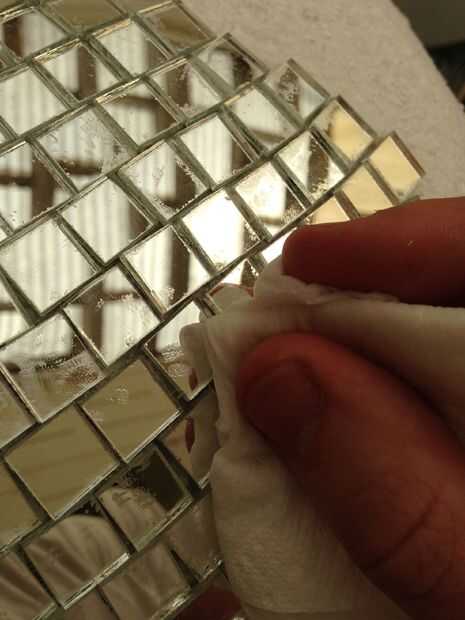 Si el pegamento del azulejo del espejo entra en la superficie del vidrio (difícil de evitar!), se puede quitar después de seca con una humedad, pero no mojado, paño o toalla de papel.