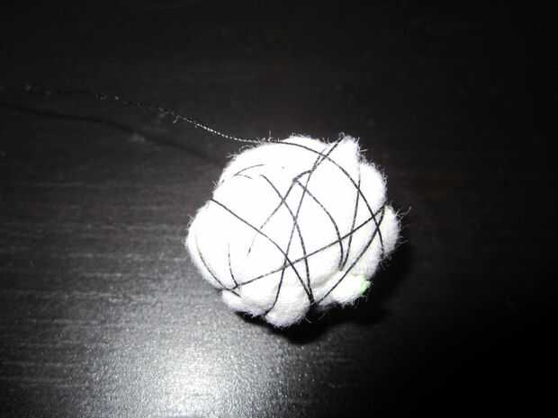Alrededor 3-5 pies de hilo, dependiendo de cómo grueso es el hilo. Atar el hilo alrededor del ojo de la aguja, luego empuje la aguja a través del centro de la bola de algodón y un nudo. Ahora simplemente Envuelva el hilo alrededor de la bola hasta que tenga unas cuantas pulgadas a la izquierda. Desea envolver el hilo alrededor lo suficientemente apretada como para mantener el algodón en una bola, pero no demasiado apretado.