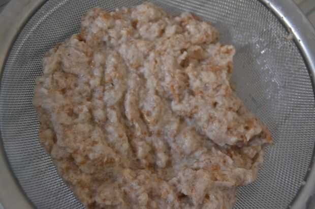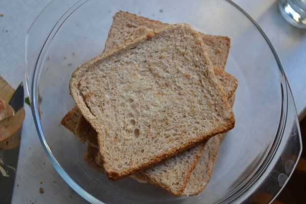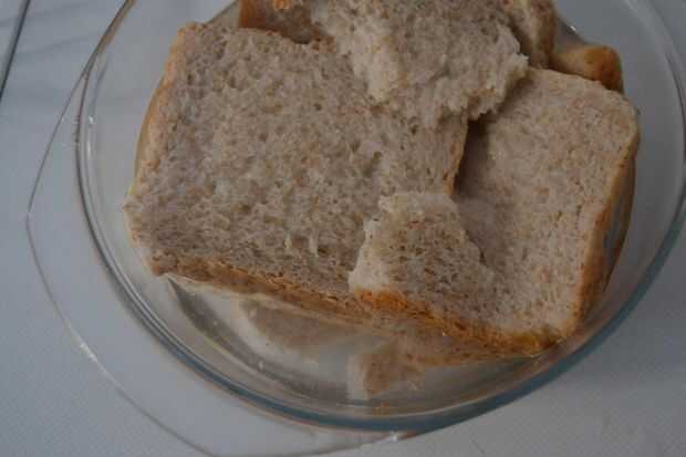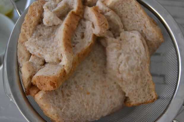 Coloque las rebanadas de pan en un bol y remojar en agua caliente. después de 10 minutos, poner las tostadas en un tamiz de malla fina para drenar el agua. con las manos, empujar tanta agua de las rebanadas como sea posible, usted terminará con una mirada no muy agradable, masa grumosa. pero eso es aceptable.