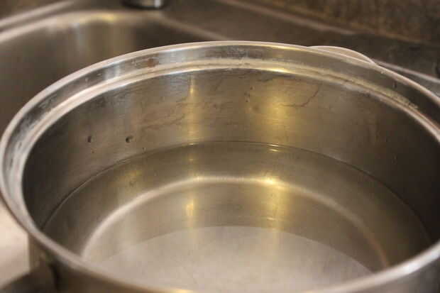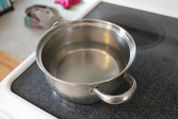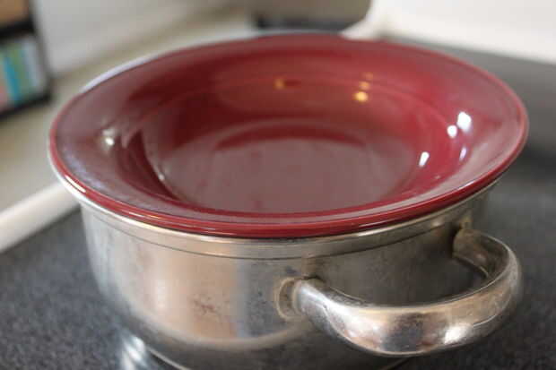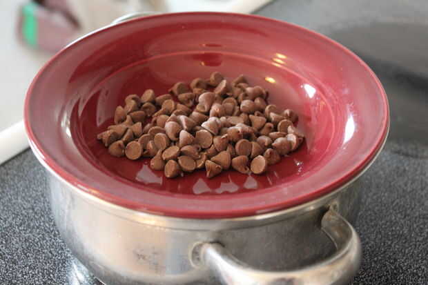 Primero, tomar su bote y llenarlo de a mitad de camino con agua. Luego tomar la taza y ponerlo encima de la olla. Llene el fondo del tazón de fuente con chips de chocolate y luego encienda el calor a mitad de camino. Remover hasta que derrita.