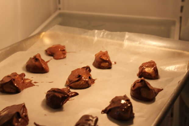 Bueno, una vez acabado de capa y colocar las "bolas" en la bandeja para hornear galletas, claro un lugar en el refrigerador y poner las "bolas" en allí. Les descansar allí por aproximadamente una hora o hasta que el chocolate se enfríe.