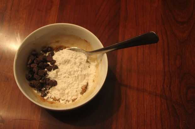 Añadir la harina y los chips de chocolate y mezclar bien. Si la masa está demasiado desmenuzable, echar un chorrito de agua, si la masa está demasiado húmeda, añada harina.