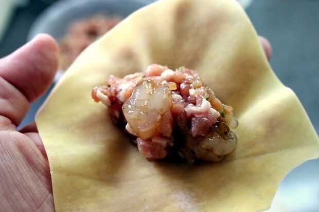 Ahora organizar su lugar de trabajo: de derecha a izquierda, coloque las envolturas de Wonton, luego el recipiente con el relleno, luego un pequeño recipiente con agua fría y un plato grande espolvoreado con fécula de maíz, así que los wantanes no se pegan a la placa.